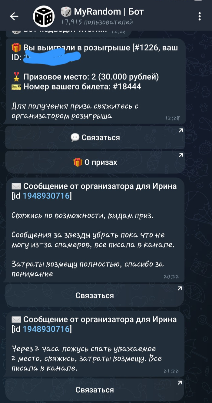 Сегодня мне пришло уведомление в боте о том, что я заняла 2-ое место и мне нужно связаться с организатором конкурса. Тут уже конечно насторожил тот факт, что организатор не связалась сама и более того в своём канале не опубликовала победителей, а просто опубликовала пост о том, что итоги уже подведены.