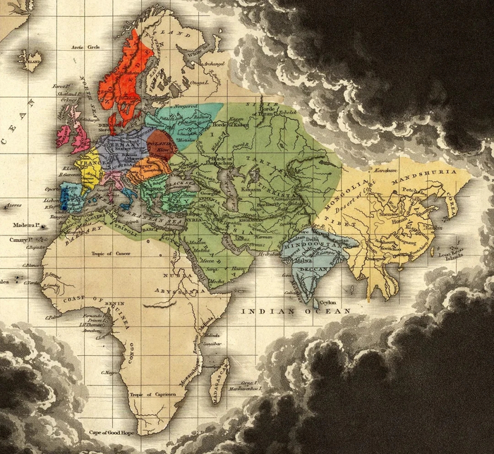 Континенты покрыты визуальными изображениями ландшафта, повсюду свитки с географическими названиями океанов и островов. Слоники в Индии, фламинго в Патагонии и лёвы в Африке — это на репродукции 1887-го года.