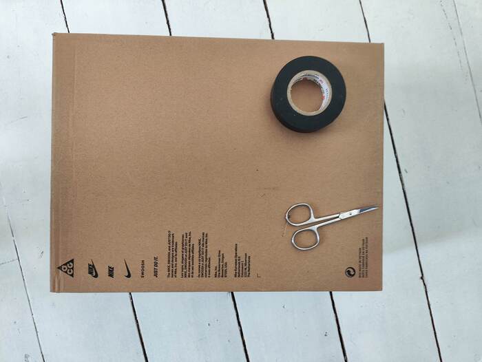 Нужна коробка с крышкой от её, двухсторонний скотч,изолента,ножницы и терпение