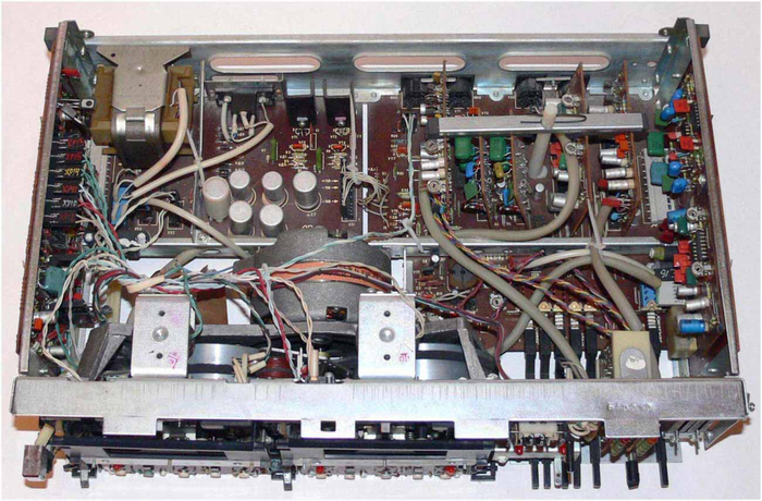 Тыльная сторона корпуса отведена под разъемы для подсоединения акустических систем, линейные входы и выходы, а также сетевой разъем с предохранителем. Конструктивно магнитофон выполнен по модульному принципу: все функциональные блоки устанавливаются в общую кросс-плату, что теоретически облегчает ремонт и сервисное обслуживание.