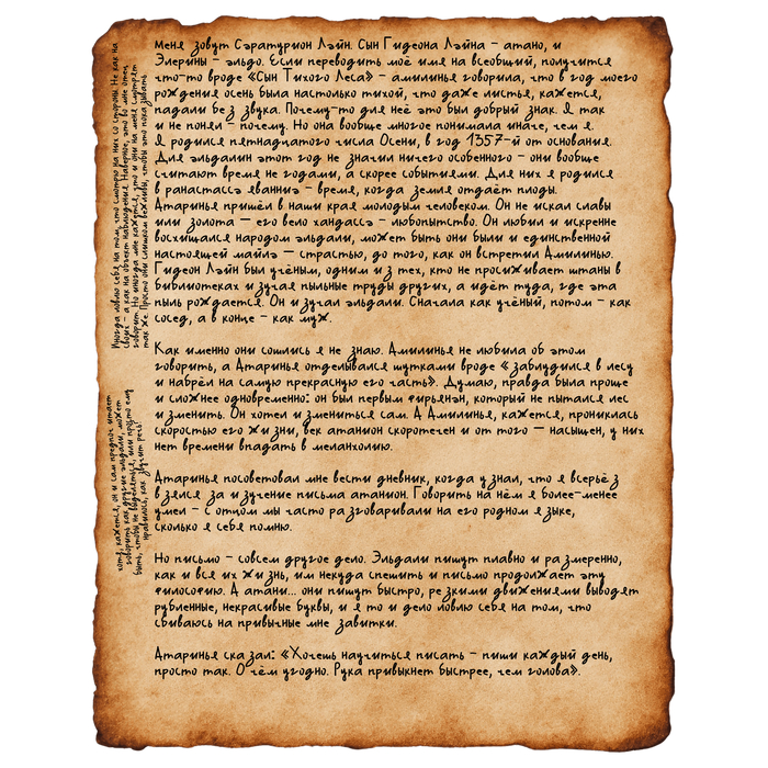 Эльфы ушли, но наши души не сдержит никакие барьеры. Создавайте себя как сталь, как клинок, и вы почувствуете бессмертие. Если кто-то из вас овладеет собой, тем вы приблизитесь к эльфам. А если вы обретёте себя, то откроются врата сумерек, сила и воля будут достаточными, и вы не сможете быть остановленными заслонами. Может быть мы объединимся ни в жизни ни в смерти.