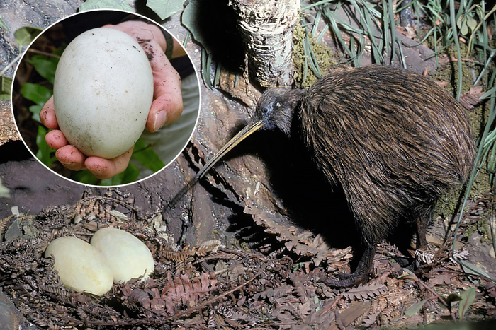 С размножением у киви тоже всё исключительно оригинально. Начнём с того, что самка весом в 4 килограмма откладывает яйцо весом в 450 грамм! Одно. А через 25 дней может взять и отложить ещё одно.