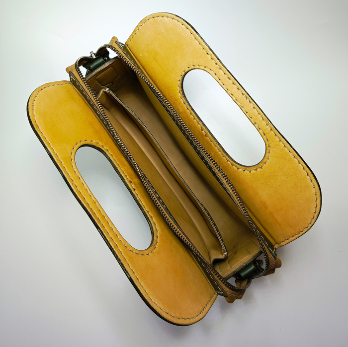 Инкрустация металлических деталей в кожу (когти на лапе медведя и клык) усиливает контраст, где мягкость натурального материала гармонирует с холодной монументальностью металла, создавая визуальный, тактильный и эмоциональный ряд.
