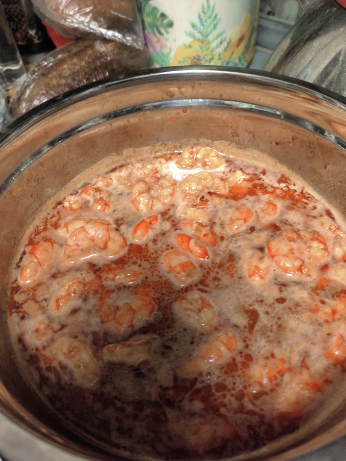 И отправляем в холодильник часов на 6-8. Потом достаём и на сковороду. И ставим на плиту . Я поленился и поставил в миске в которой мариновал, лучше так не делать... Доводим креветки до кипения, ждём 5-8 минут и снимаем с огня.