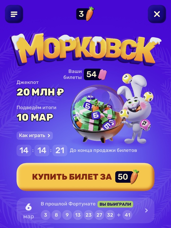 Проведя 500 туров по 50 билетов получаем, что баллы выпали в 75 турах (15%), в том числе: 150 баллов в 1 туре (0,2%), 75 балов - в 8 турах (1,6%), 50 балов - в 29 турах (5,8%), 25 балов - в 42 турах (8,4%), а остальные 425 тура прошли без выигрышей в баллах. Даже получить 45-80 морковок и то не каждом туре можно. Максимальный выигрыш в баллах - 175, в морковках - 830. Тратится по 2500 морковки в каждом туре.