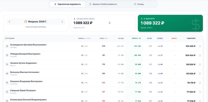 Прозрачный «Цех». Я завел карточки на весь персонал. Теперь Мастер в конце смены занимается этим ставит опоздания на смену, отмечает больничный, начисляет КТУ или вписывает штраф — дело двух кликов. А к моменту выплаты ЗП у меня (и у руководства) есть готовая, понятная база без единой ошибки.