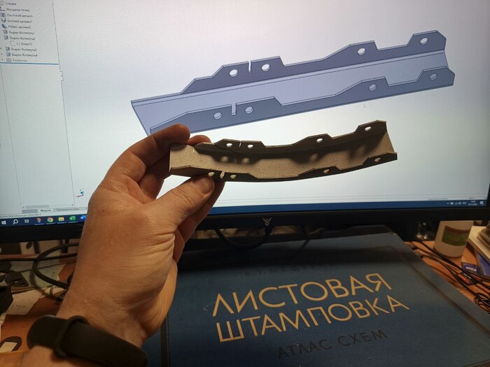 Вроде простая? А нифига. При проектировании надо учесть, что после гибки случится распружинивание и учесть его. Т.е. сделать оснастку так, чтобы она давила "в перегиб". Ну, короче, норм. Получается.