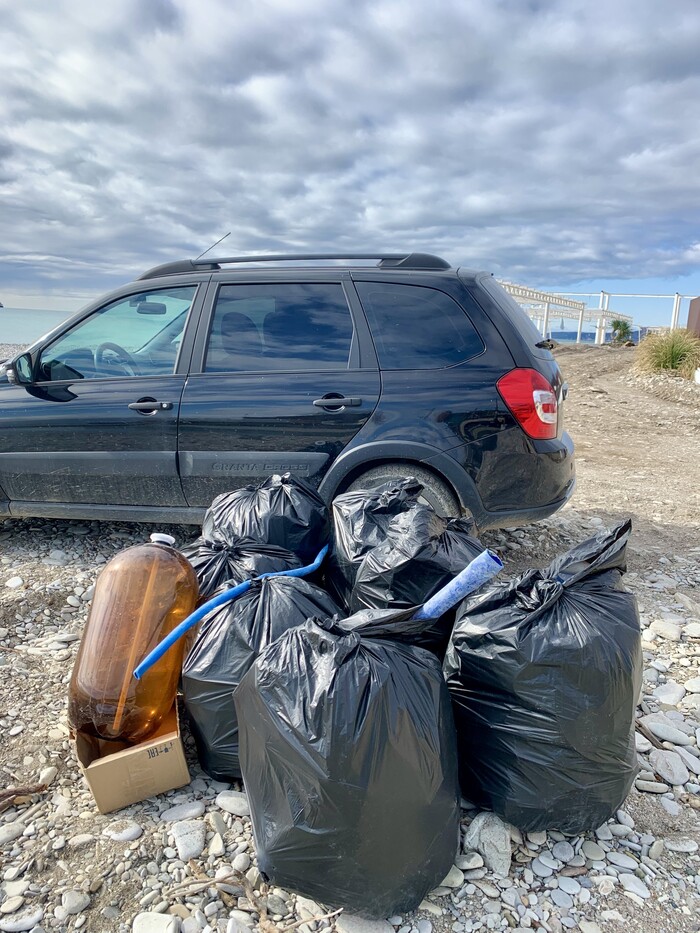 За 2 часа мы собрали 7 мешков вместимостью 160 литров. Самое трудное — не собирать сам мусор, а дотащить эти мешки до машины. Они получались очень раздутыми и тяжелыми, волочить из по песку и гальке совсем не сподручно. Пришлось ходить несколько раз, чтобы принести их к машине. Потом еще надо было отнести в мусорный контейнер — в не все мешки можно было везти на машине, потому что некоторые из них пахли совершенно отвратительно.