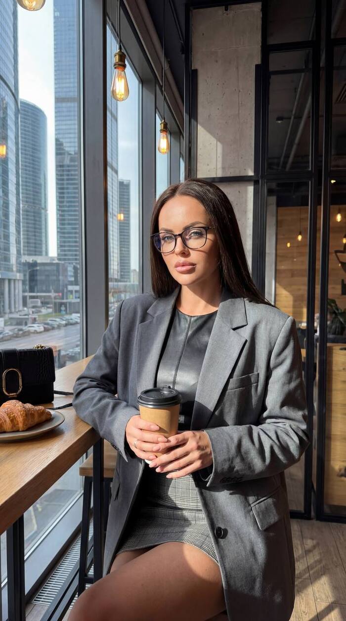 Героиня: молодая женщина с гладкими ухоженными волосами. На ней модный серый пиджак oversize, черный кожаный топ, короткая клетчатая серая юбка. Губы с легким блеском. Образ дорогой и деловой.