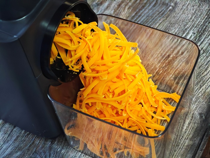 С помощью такой электрической овощерезки-шинковки довольно удобно и быстро можно приготовить исходное сырье для запекания различных закусок. Например, мне очень нравятся горячие бутерброды - на основе сыра-колбасы и со слегка подрумяненным хлебом.