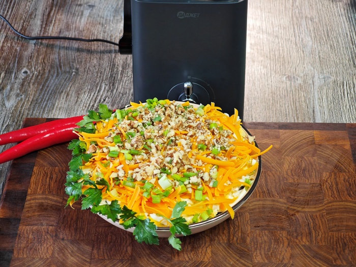 И никакой усталости в руках и слёз над луком, только ровная, аккуратная нарезка, которая делает любое блюдо не только вкусным, но и красивым. Если не учитывать время на предварительную варку овощей и прочего, то на шинковку и "сборку" салата ушло от силы минут 8.