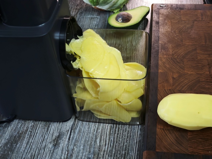 Довольно бодро режет - это хорошо видно на видео. Осталось обжарить во фритюре и добавить немного соли.