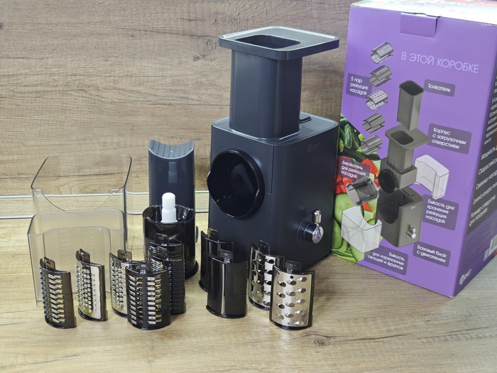 В комплекте несколько типов режущих насадок под разные цели - и тонкие ломтики, и покрошить- все можно, сделать декоративную нарезку, наслайсить чипсы, даже перемолоть фрукты в мякоть.