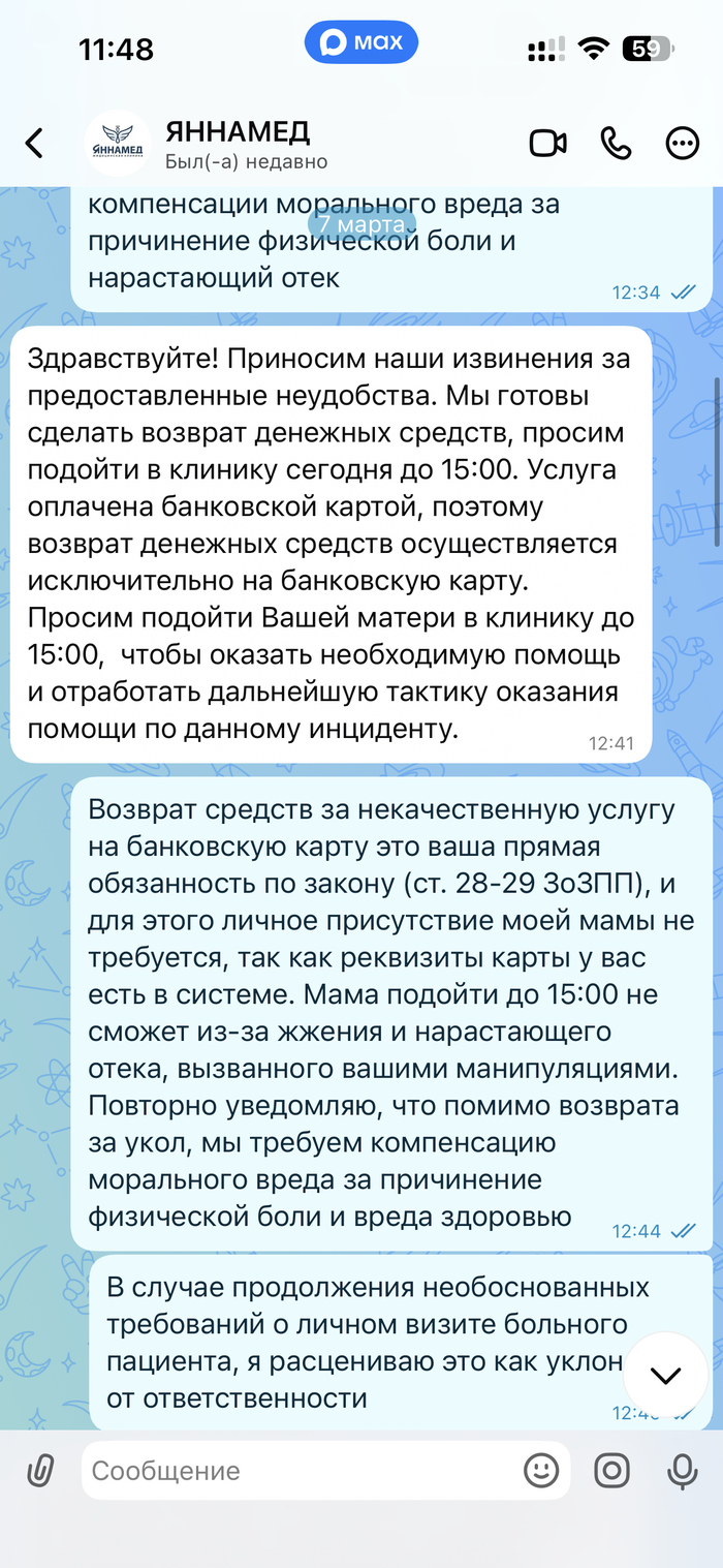 Клиника Яннамед (Якутск)измучили пенсионерку уколами, посоветовали Скорую и удалили чат