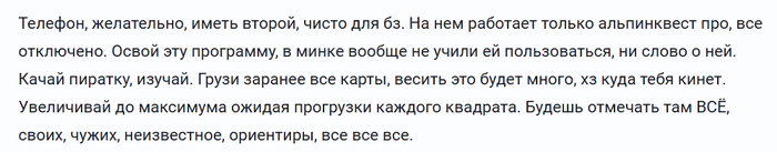 Телефон, желательно, иметь второй, чисто для бз. На нем работает только альпинквест про, все отключено. Освой эту программу, в минке вообще не учили ей пользоваться, ни слово о ней. Качай пиратку, изучай. Грузи заранее все карты, весить это будет много, хз куда тебя кинет. Увеличивай до максимума ожидая прогрузки каждого квадрата. Будешь отмечать там ВСЁ, своих, чужих, неизвестное, ориентиры, все все все.