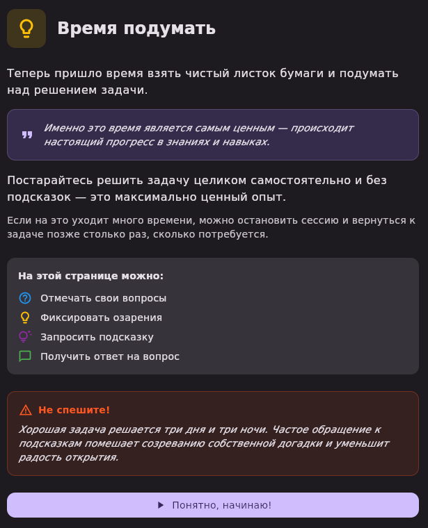 В библиотеке задач можно создать не только примеры из учебников, но и реальные жизненные ситуации, которые требуют анализа и логики. Диагностика двигателя автомобиля, расчет нагрузки на балку, поиск причины утечки в трубе или даже как снять застрявшую деталь с вала кухен машин :) — всё это можно оформить как задачу, отследить ход мыслей, использовать AI для проверки гипотез и сохранить решение в свою базу знаний.