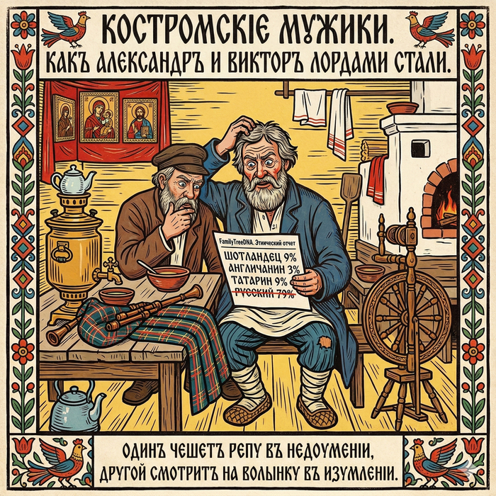 FTDNA и вовсе пустился во все тяжкие: целых 9% англичан, шотландцев и уэльсцев! Вообразите только эту дивную картину: костромские мужики в клетчатых килтах, играющие на волынках среди дремучих лесов Макарьевского уезда! Овсянка, сэр Никифор Гордеевич, кушать подано-с! Как говорится, нарочно не придумаешь. Выводы делайте сами.