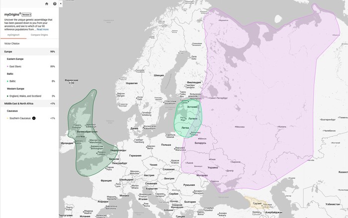 MyHeritage гнет свою линию: картина зело схожа с батюшкиной, но сия лаборатория почему-то настойчиво, с каким-то даже упрямством, выделяет Латвию. Какая невидимая нить связывает латышские хутора и костромские избы - сие ведомо лишь Создателю.