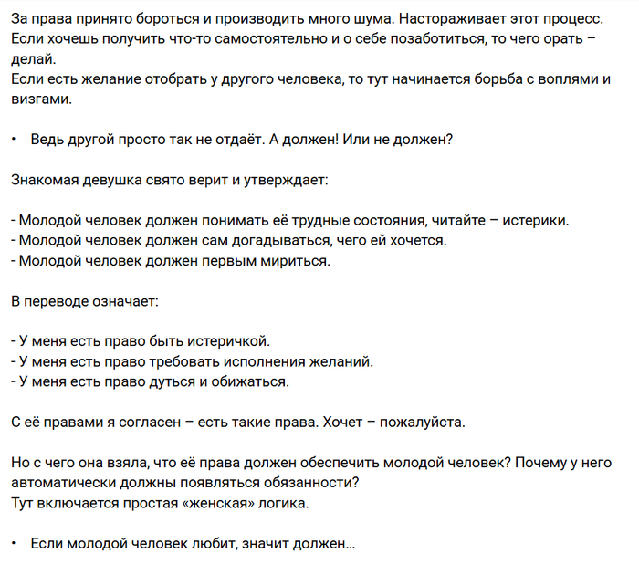 Распространённое мужское заблуждение: кто платит - тот и заказывает музыку. Ничего подобного. Не знаю, как на подлом Западе, а в России мужик обязан платить за бабу просто так. За анатомические особенности и за лживые ценности. То есть ни за что. Заплатил? И тьфу на тебя. В России сегодня у женщин нет ни обязанностей, ни моральных ценностей. В России ни одна женщина никому ничего не должна. В России мужчина должен. Никакой заказанной музыки не будет. Не считать же музыкой слюнявые истерики и визгливые скандалы.