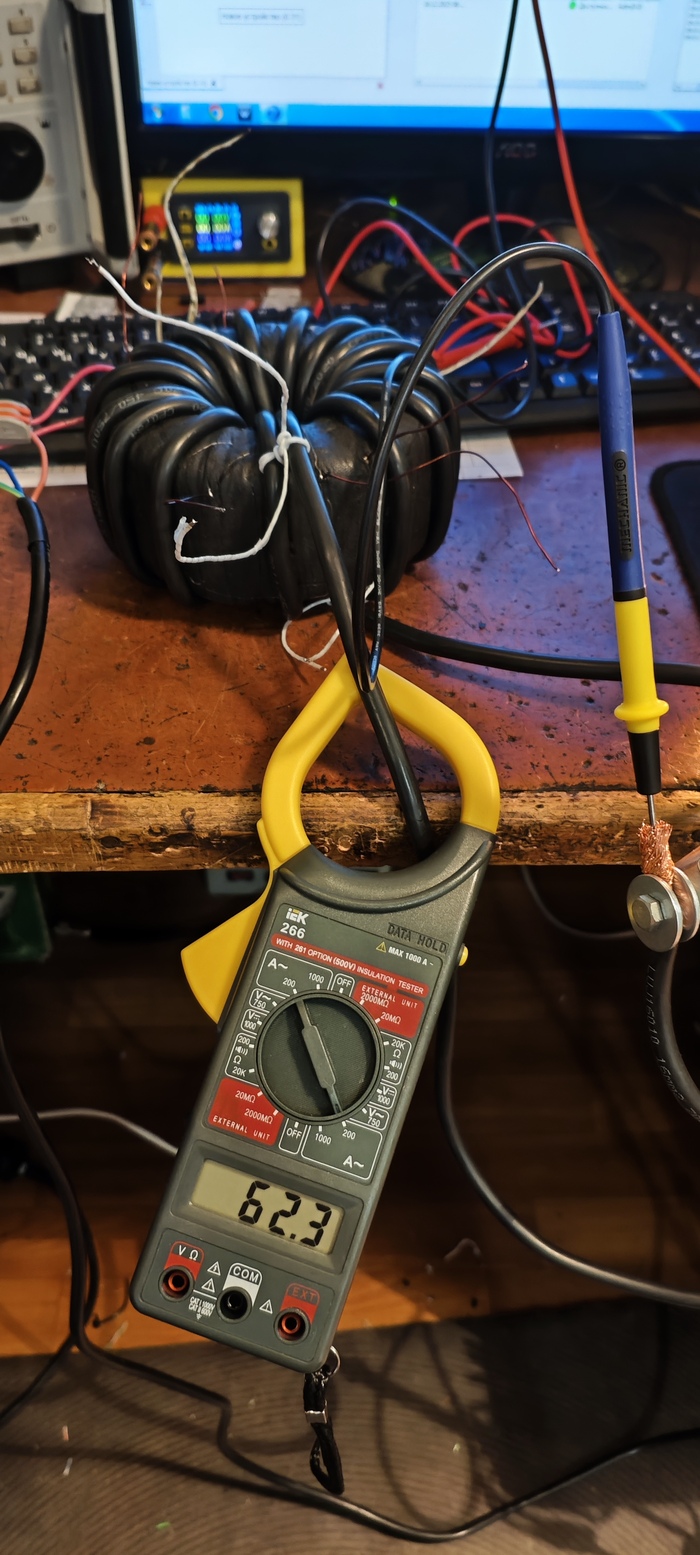 Накальный трансформатор тороидальный, первичная обмотка 1мм2, вторичная 16мм2. Напряжение 6.3в. При подключение лампы напряжение при пуске проседает на 1.5 десятки но потом стабилизируется на отметке 6.7в при 240в в сети. Ток потребления лампы по накалу от 60 до 70А и во многом зависит от напряжения в сети. Ну как никак 0.5кВт обогреватель.