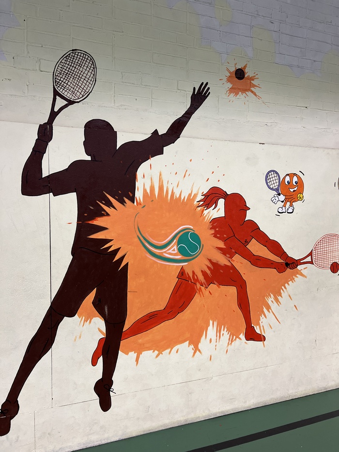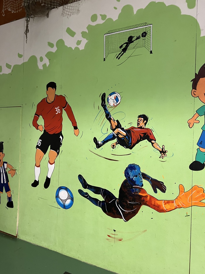 Конечно, главным символом любой уважающей себя качалки был и остается Арнольд Шварценеггер. Куда же без Железного Арни? Его мы изобразили в фирменной, а на соседней стене, в процессе тяжелой работы со штангой. Классика, которая работает всегда.