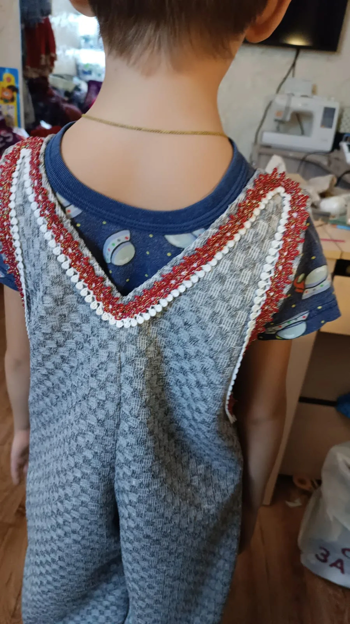 Костюм для мальчика: трикотажный полукомбинезон, рубашка лён . Отделка костюма сочетается с костюмом девочек.