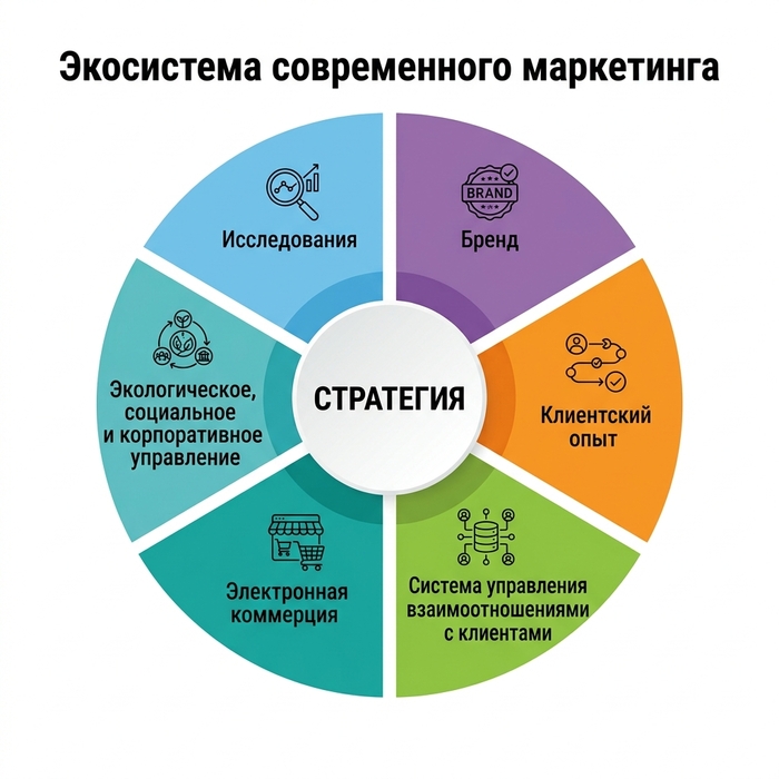 Маркетинг работает как система, а не как набор разрозненных инструментов: стратегия задаёт курс, исследования и аналитика снижают риск ошибок, бренд формирует долгосрочную ценность, клиентский опыт и пользовательский опыт (сustomer experience/user experience, CX/UX) повышают конверсию, а система управления взаимоотношениями с клиентами (customer relationship management, CRM) удерживает клиентов и растит пожизненную ценность клиента (Lifetime Value, LTV).