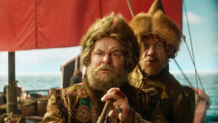 Море, которого в фильме очень много, то просто наложенные кадры (и это видно, а-ля сцены поездки в автомобиле в фильмах 30-х - 50-х годов), то это коряво нарисованный кисель (зарекламленная сцена встречи Черномора и купцов, там прям "сопля" на пол головы Черномора висела и на монтаже этого, почему-то, никто видимо даже не заметил).