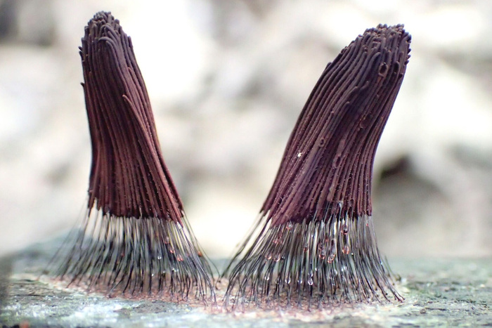 Жизнь слизевиков делится на две стадии: плазмодий и эталии. На представленных снимках – они сделаны на кордоне Каменная падь заповедника «Комсомольский» - запечатлены эталии, то есть плодовые тела с созревающими в них спорами. Выросший из этих спор плазмодий выглядит, как чей-то плевок, и самое необычное – он способен передвигаться, делая это, как амёба: перетекает с места на место, выпрастывая ложноножки.