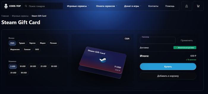 Пошаговая инструкция: пополнить Steam через Code-top.shop