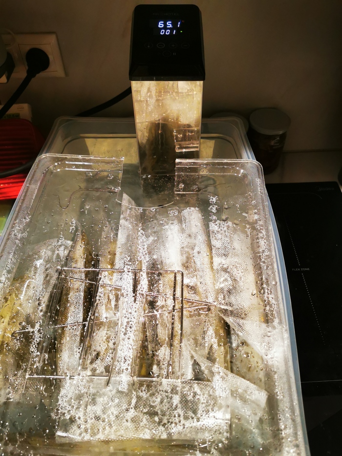 После чего достаем кастрюлю\емкость для нашего су-вида и его самого родного, выставлем температуру в моем случае это типичный медиум, потому выставил 57,5 градусов на 1,5 часа, фотки торчащего сувида нет, идем дальше.