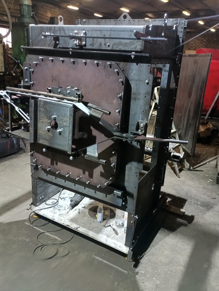 Фото2. Камера загрузки топлива. Дверь получилась тяжёлая — пришлось делать мощные петли и регулировку прижима.