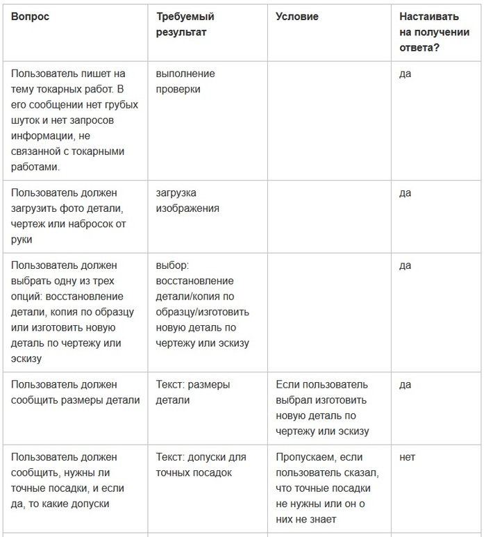 Ну и в-третьих, современные электронные говорилки до ужаса дружелюбны, и, в теории, могут тем самым продавать. То есть уговаривать пользователя сделать заказ, если он сомневается. Это, может быть, не очень заметно на примере заказа токарных работ. Ах да, я еще не сказал. Мой бот не заточен только на токарные работы. Все его поведение задается конфигурационным файлом - таблицей в экселе на одну страницу, в которой все поведение описано человеческим языком, примерно так, как вы бы писали скрипт для оператора кол-центра.