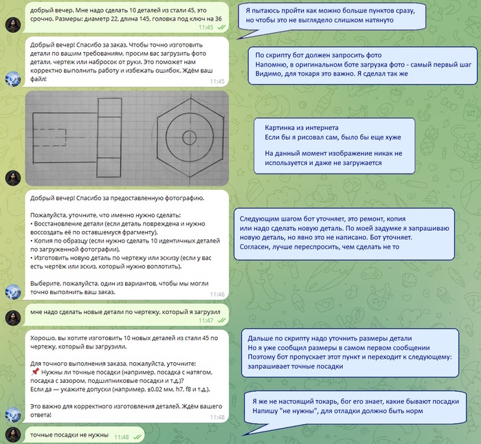 Почесав репу, я сделал свой бот, который старается выполнить ту же функцию, что и оригинальный. То есть, собрать с пользователя информацию о заказе на токарные работы. Однако мой бот общается как человек. Заказчику не надо нажимать на кнопки. Заказчик пишет словами, что ему надо. Точно так же, как он бы писал живому токарю. Бот собирает требуемую информацию из слов заказчика. Если чего-то не хватает, бот задает наводящие вопросы. Почему это лучше, чем традиционный бот с кнопками?