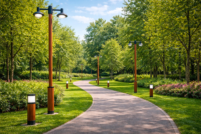 Мы реализуем проекты наружного освещения общественных пространств с применением современных опор и светильников с элементами из ДПК (древесно-полимерного композита). Такие решения сочетают в себе эстетичный внешний вид, устойчивость к климатическим воздействиям и долговечность, что особенно важно для городских и парковых территорий.
