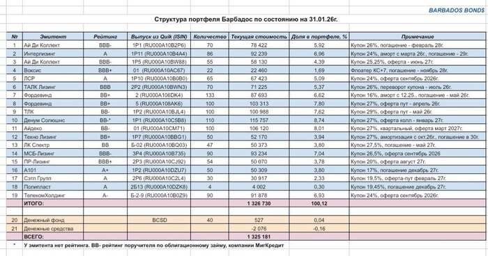 2. Портфель Барбадос. Структура активов - 80-90% ВДО, 10-20% облигации инвестгрейда (рейтинг А и выше). Портфель публичный, все сделки были раскрыты в канале https://t.me/barbados_bond. Портфель начал формировать 10 февраля 2025г., поэтому годовая доходность получена расчетным путем за период 324 дня. Доходность портфеля - 35% годовых.