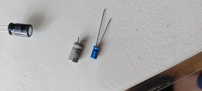 Показываю разницу в габаритах старых конденсаторов и новых, аналогичных по номиналу и напряжению