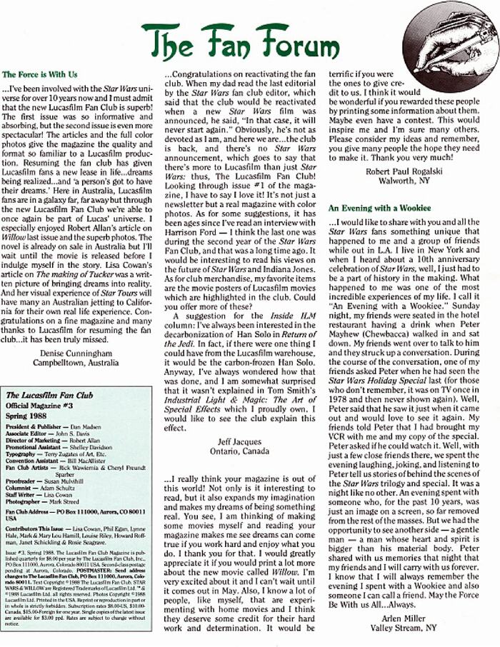 Здесь, в Австралии, фанаты Lucasfilm словно в далекой‑далекой галактике, но благодаря новому фан‑клубу Lucasfilm мы снова можем стать частью вселенной Лукаса. Особенно мне понравилась статья Роберта Аллана о фильме Willow в прошлом номере и великолепные фотографии. Роман уже поступил в продажу в Австралии, но я подожду выхода фильма, прежде чем погружусь в эту историю.
