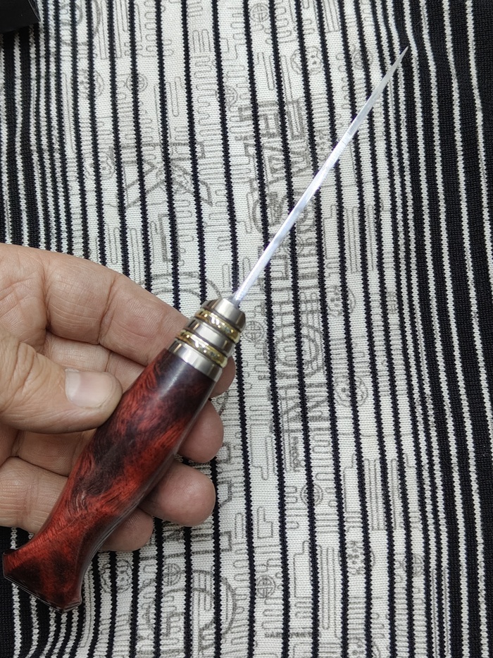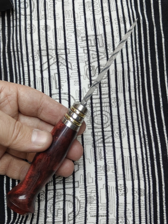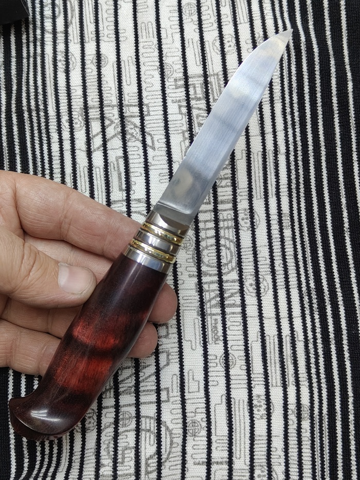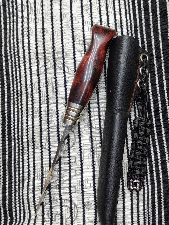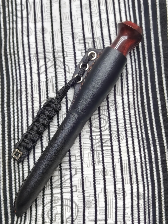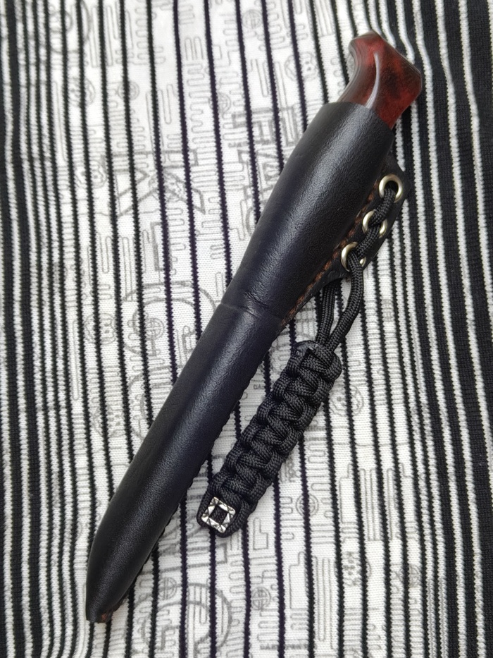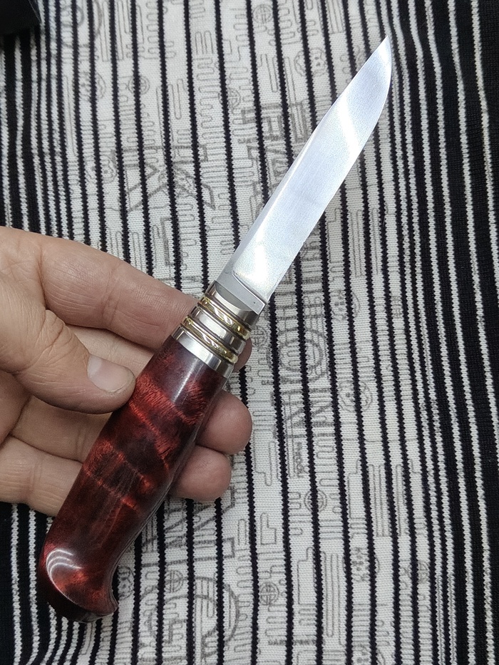 Грибная смерть, тихоохотный ужас! Баловство на досуге. После большого перерыва решил не начинать сразу с большого ножа и сделал вот это. Клинок из стали Д2 на 61 ХРЦ, 90х16х2,5 мм, полировка, травление, сатин Р1500. Рукоять 100 мм, титан, латунь, Ж10, стабилизированная береза, пин, какой-то нашел. Монтаж сквозной, на стяжку М4, эпокси-титан.Ножны их кожи, с вкладышем. Кожа не растишка, потому отформовалась так себе. На удивление удобная штука получилась