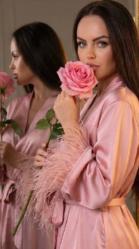 Пропорции фото 9:16, вертикальный кадр. Внешность повторить строго по референсу, сохранить 100% узнаваемость, естественную текстуру кожи, натуральную асимметрию. Строго правильные пропорции тела. Девушка в розовом атласном халате с перьевыми манжетами стоит перед винтажным золотым зеркалом. В руках крупная роза у лица. В отражении ее профиль. Мягкий теплый свет, золотые блики, высокая детализация лепестков, шелка и рамки зеркала. Без текста.