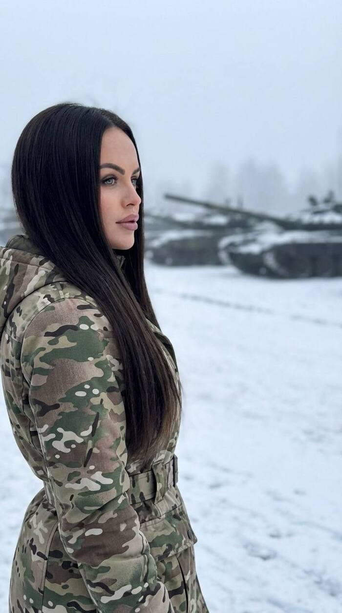 Пропорции фото 9:16, вертикальный кадр. Фотореалистичная fashion-фотография, высокое разрешение, 4K, без рисованности и без CGI, натуральная кожа с микротекстурой. Используй приложенное фото как референс лица и внешности, и сохрани её без изменений. Кадр: профильный портрет по пояс, молодая женщина в камуфляжной форме стоит на улице зимой. Она повернута левым профилем к камере, смотрит вдаль. Ухоженные волосы гладкие и блестящие. Поза спокойная. Фон: заснеженная площадка, на дальнем плане размытые силуэты военной техники, несколько танков стоят в ряд. Погода пасмурная, холодная дымка. Фон сильно размытый, техника читается как силуэты без лишней детализации. Одежда: камуфляжная куртка, ремень на талии, аккуратные швы и фактура ткани. Без крови, без жестоких деталей, без текста и водяных знаков. Свет: рассеянный дневной в пасмурную погоду, мягкие тени, холодная цветокоррекция.2. Девушка в тире с пистолетом
