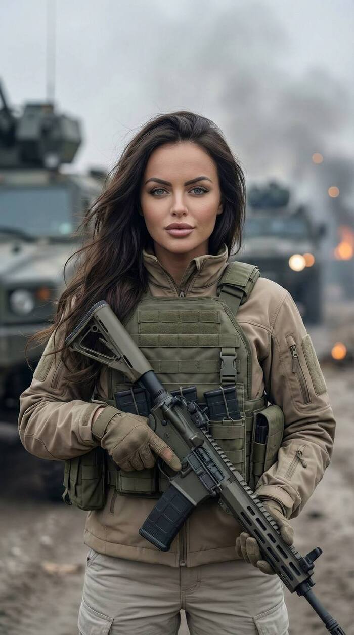 Пропорции фото 9:16. Фотореалистичный кадр с сохранением личности человека с личного фото (референс лица). Сохранить 100% узнаваемость. Без эффекта пластика, высокая детализация кожи, волос. Премиальная минималистичная эстетика, без CGI и без рисованности, натуральная кожа с микротекстурой. Девушка, красивые блестящие ухоженные волосы. Сцена: кинематографичный репортажный портрет на фоне военной колонны, размытые бронемашины позади, легкий дым и пыль в воздухе, мягкое пасмурное освещение, дальний огонь как маленькое боке в глубине кадра, никаких флагов и символики. Композиция: центр кадра, средний план по пояс, камера на уровне груди, взгляд прямо в объектив, спокойное уверенное выражение лица. Одежда: оливковый бронежилет, современный модульный жилет с MOLLE, куртка песочного оттенка, перчатки, светлые тактические брюки. Действие: девушка держит современную винтовку в безопасной позе поперек корпуса, палец вне спускового крючка. Детали: высокая резкость по лицу и глазам, реалистичная ткань и фурнитура, мягкая глубина резкости, фон размыт, цветокоррекция в холодно нейтральных тона
