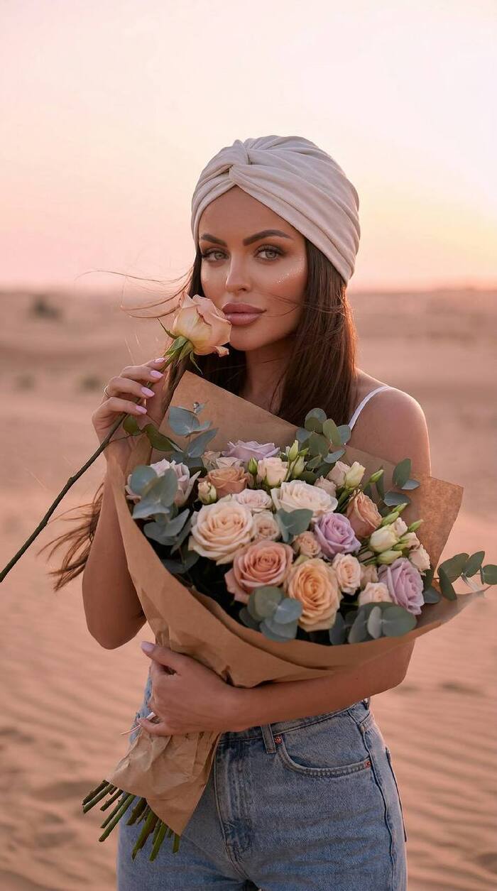 Пропорции фото 9:16, вертикальный кадр. Внешность строго повторить по референсу, 100% узнаваемость лица, без изменения формы губ, глаз, носа, бровей, структуры кожи, без ретуши-пластика. Строго естественные анатомические пропорции, без искажений перспективы и удлинения конечностей. Локация: песчаная пустыня на закате, теплый розово-золотой свет. Девушка держит большой букет в крафтовой упаковке (розы, эвкалипт, пастельные оттенки). В другой руке одна роза она подносит ее к носу, на голове светлая повязка или тюрбан, макияж глянцевый и выразительный, теплый закатный свет. Джинсы высокой посадки, минималистичный белый верх. Ветер слегка колышет волосы. Кинематографичная глубина резкости. Без текста и брендов.