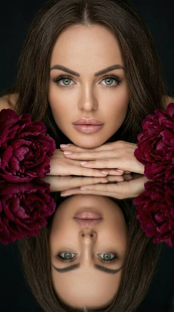 10. Отражение лица в зеркале с бордовыми пионами