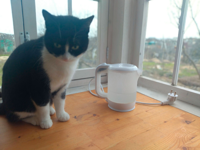Летом он жил на веранде, а на зиму плотно перебрался в дом, как и кошка. И тут началось.. Я несколько раз проводила с ней беседу, объясняя, что электрочайники таких, как она, не едят, но всегда видела в ее взгляде возражения: "Ну а вдруг?! Вот ты выйдешь за дверь, а он на меня набросится! Я же вижу, что он хочет меня проглотить! Именно для этого он пустой внутри, и крышку свою вон как разевает!"