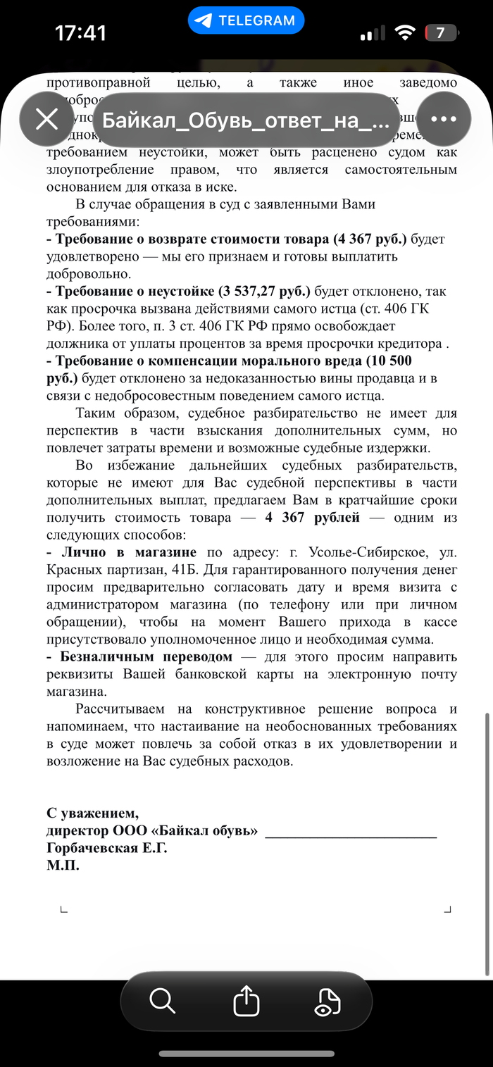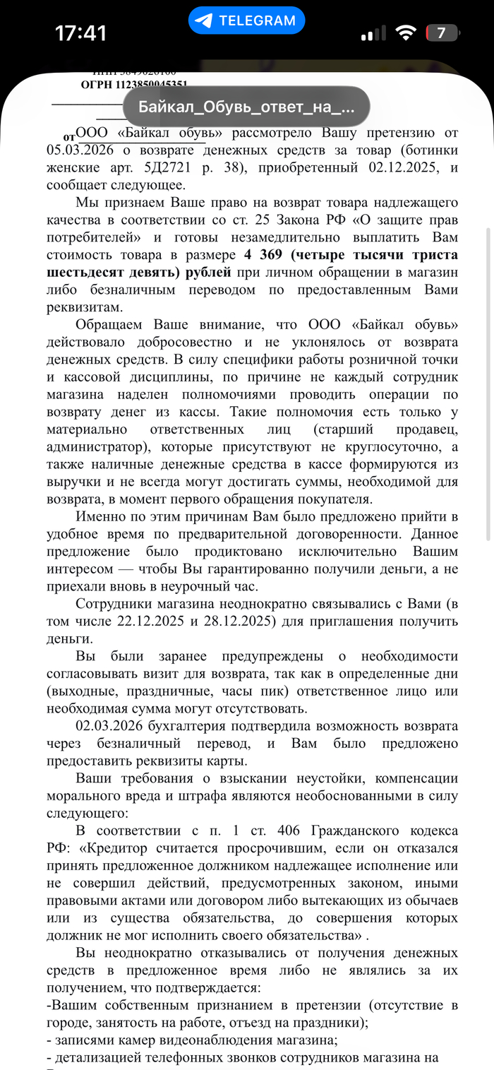 5.03.2026 я приехала в магазин с досудебной претензией. В которой попросила сумму сапог+сумму 1%в день+3000 оплату услуг юриста и 7500 морального вреда. Они конечно же отказались даже принять претензию.