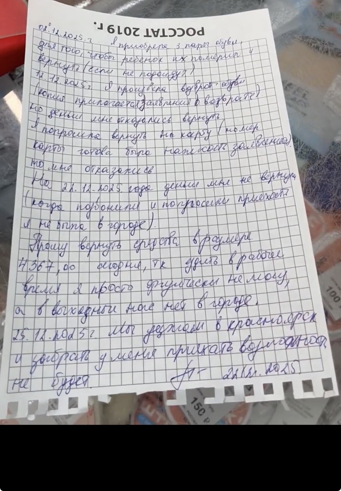 2.12.2025 года я купила 3 пары ботинок(примерить дочери и сыну), 14.12.2026 я вернула одну пару(новые, никто их не носил, брала 38 и 39, 38 возвращала). Мне объяснили что вот сейчас денег у них нет и они позвонят и сообщат когда будут приедете. Я предложила различные варианты для возврата мне Ден средств, я оставляю номер и мне переводят, я оставляю данные свои и мне возвращают средства тогда, когда я смогу приехать. Перед нг на работе завал, и я может не смогу в тот день приехать, но на карту они категорически отправлять не будут, директор озвучила что для нее это подсудное дело. Ок. На что мы договорились как будут мне позвонят. Через пару дней мне позвонили, я предложила деньги оставить, тк не было возможности забрать их. Приехала через 2 дня, денег нет. Продавец и директор были раздражены, мол ваши деньги приезжайте и забирайте. Опустим разговор, я уехала. 21 мне позвонили и предложили вернуть деньги, но я находилась в тот момент за 36 км, предложила приехать завтра. Тк денег забрать мне 4367, а тратить на бензин 600 р не очень хотелось, да и срываться посреди дня что б забрать деньги я тоже не могла, это срывать всех со мной находящихся. Приехав на следующий день денег опять нет. Я уже включила камеру, начала стенку, предупредив продавца. Предупредив что я уеду на новогодние каникулы, буду только после нг. Опять предложив им отправить мне деньги, либо оставить их и я заберу потом.