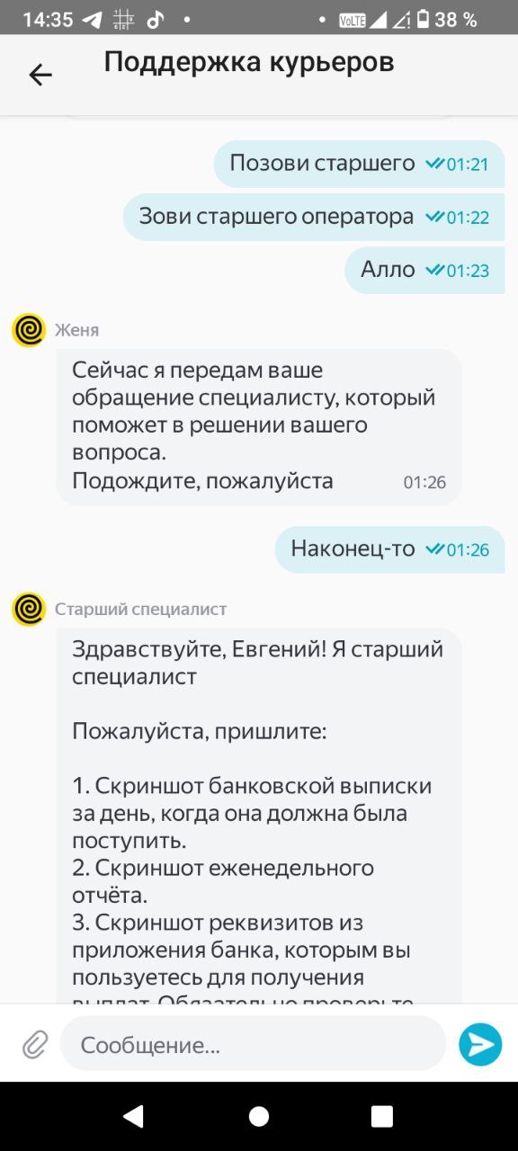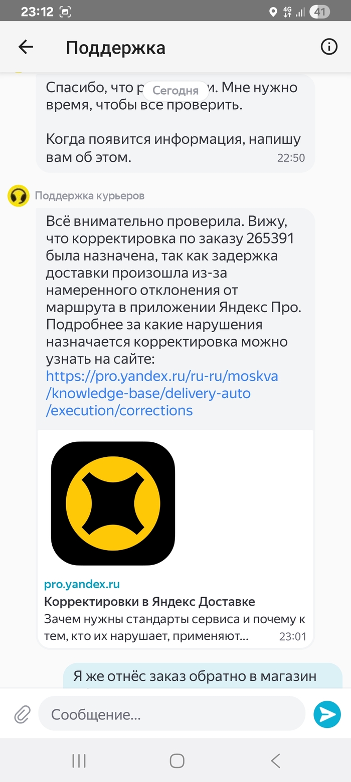 В конечном итоге в чате никто не отвечает и даже не хочет ни в чём разбираться к тому же это уже не первый раз когда Яндекс Доставка даёт штрафы которые могут быть даже за доставленные заказы (доставил все заказы все хорошо )но на следующий день приходит корректировка за недоставленный заказ ,деньги списали как это они поняли что заказ не доставлен 🤷♀️непонятно ,видимо клиент написал так и они таким и верят(в итоге вернули назад сумму штрафа спустя пол дня безпрерывного обращения в поддержку ( сначала списали ,не разобрались потом вернули написали что произошла ошибка )и это ещё очень сильно повезло.В общем и такие ситуации не редкость ,будьте аккуратны если подрабатываете в такой помойке как яндекс про,доказать кому то ,что либо здесь будет практически не реально (клиент пожалуется что не достали заказ ,хотя по факту доставили)ему поверят а курьер окажется крайним.Такие вот дела...