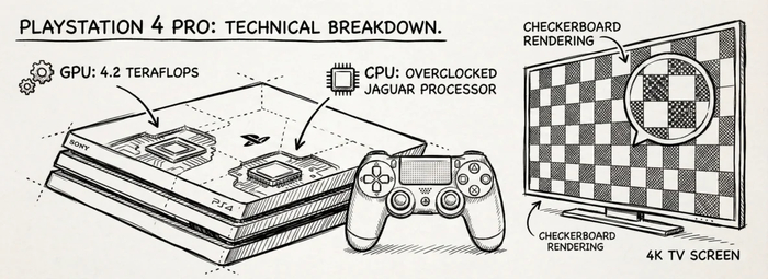 10 ноября 2016 года ознаменован релизом консоли в 2,3 раза мощнее (в графическом плане), чем её базовая версия. Инженерное чудо шахматного рендеринга приблизило нас к 4К, но для массового потребителя разница оказалась почти не заметна в большинстве случаев. Если у вас не было 4К ТВ, профит от новой консоли становился сомнительно дорогой, без явной окупаемости.