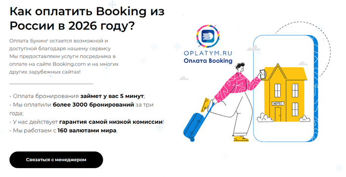 Вы переходите на сайт Oplatym и пишете менеджеру,так вы решаете вопрос, как оплатить booking из России. Передаёте данные бронирования: название объекта, даты, итоговую сумму и условия оплаты по брони.